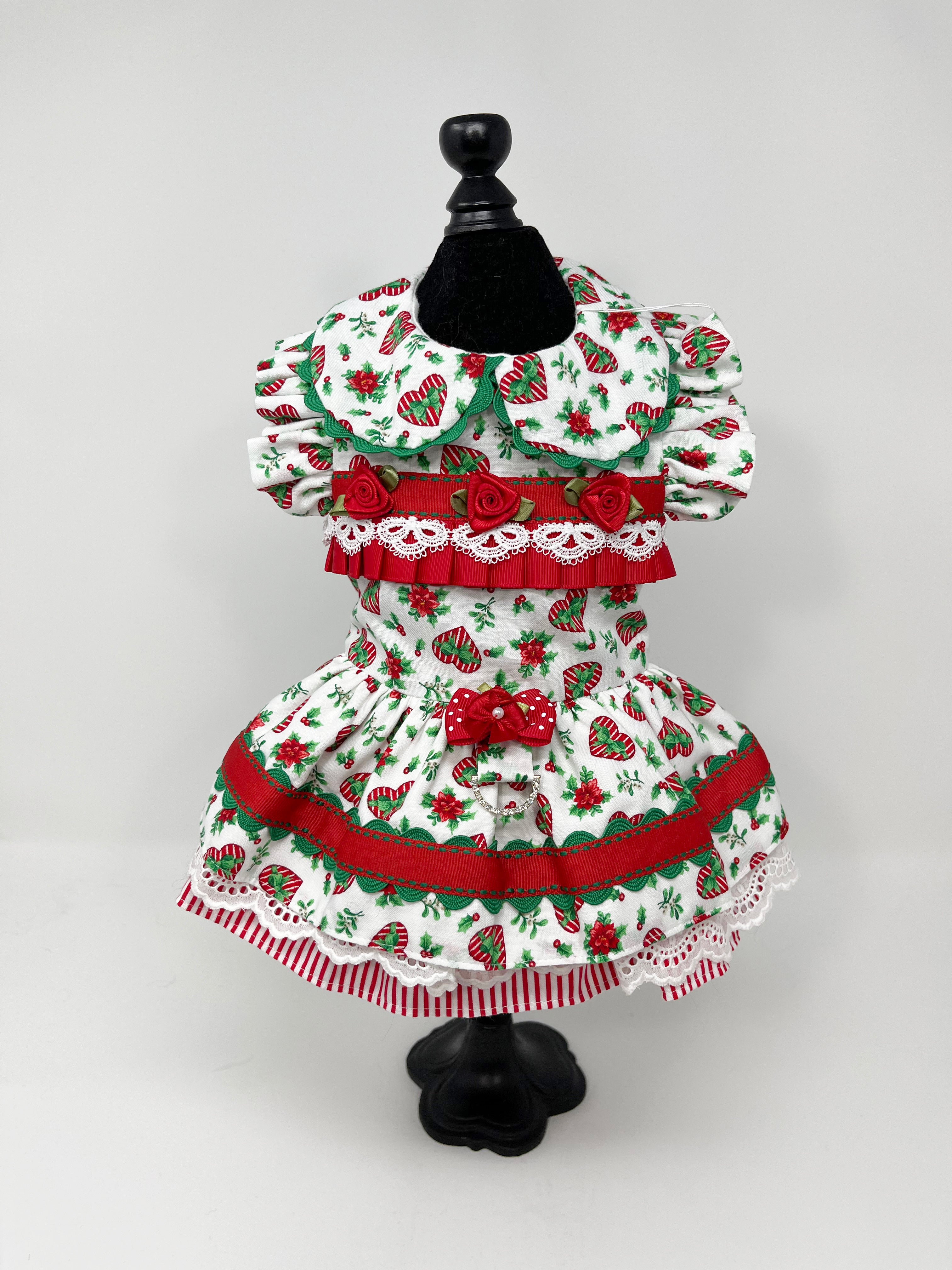 Red, White and Green Holiday Dress with Lace and Flower Embellishments.