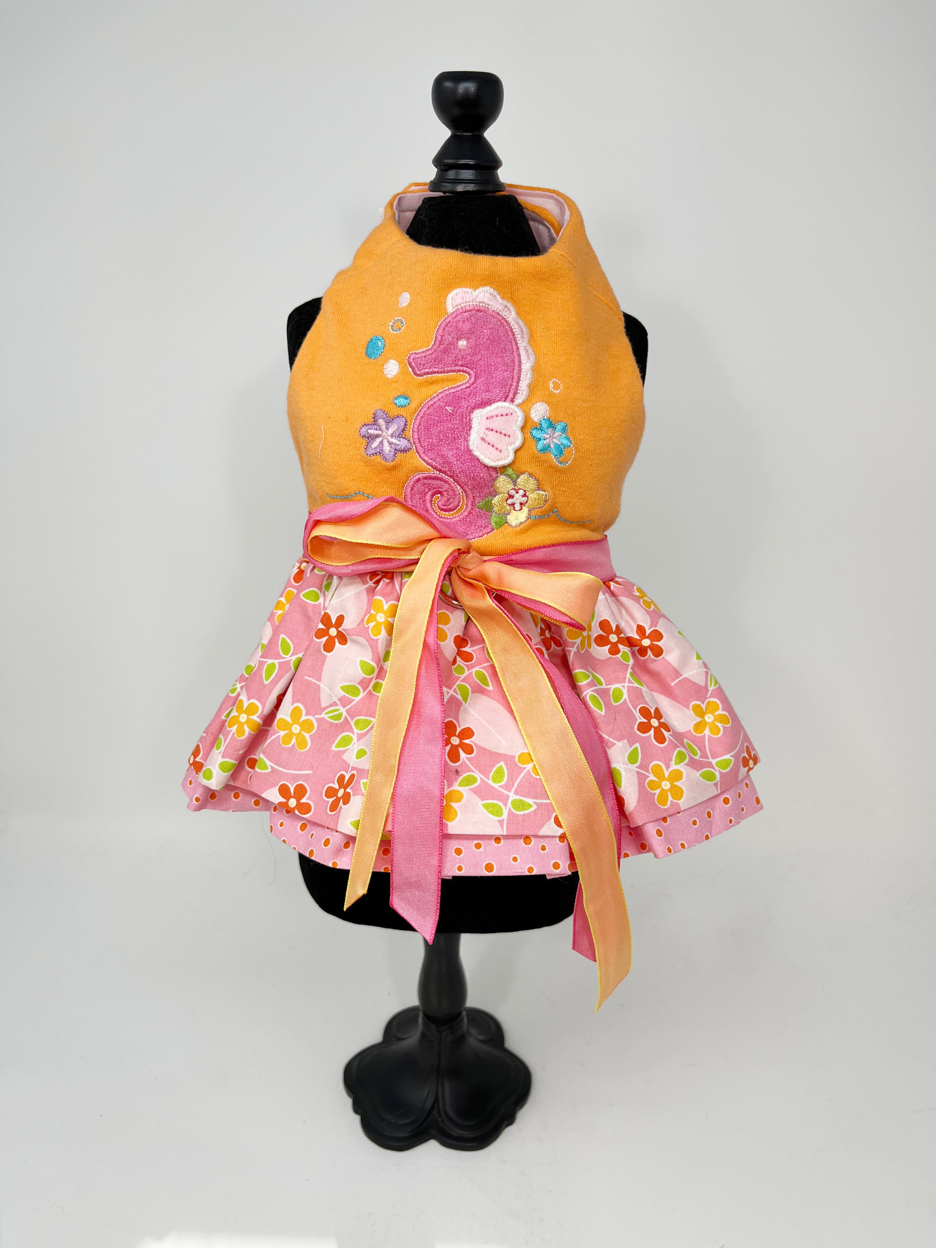 238 Orange & Fushia Seahorse Theme Dress with Ribbon Belt and Multi-Layer Skirt. Size XXS.