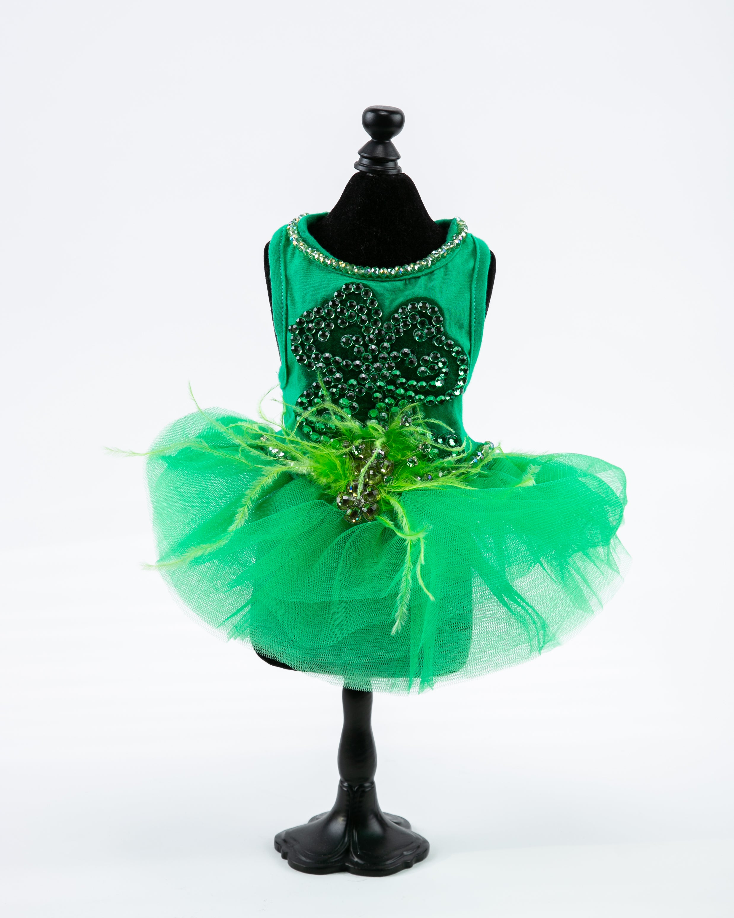 The Lucky Charm Dog Dress features a green cotton body with eight layers of green tulle skirting. The chest is adorned with a shamrock Swarvoski crystal appliqué with crystal beading at the neck and waistline. Brooches and feathers on the skirt add a fun touch.